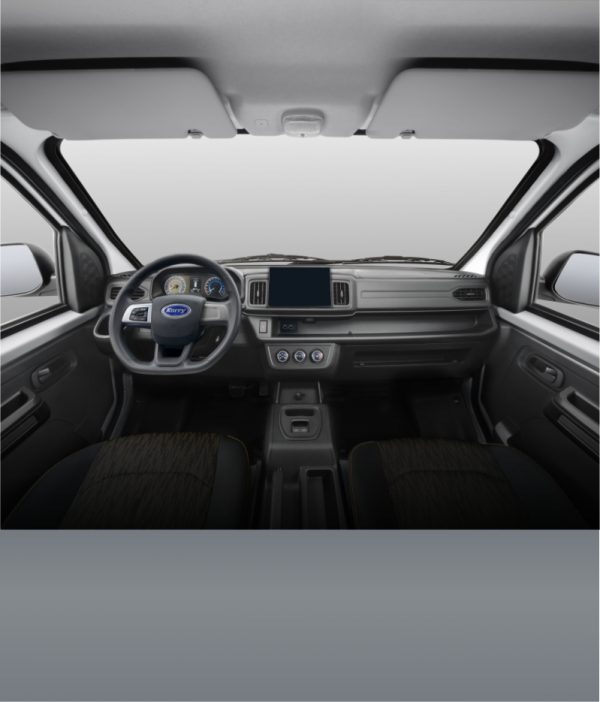 Nội thất xe tải van điện Karry E5 rộng rãi, thiết kế hiện đại, ghế nỉ chỉnh 4 hướng cho lái và phụ, màn hình giải trí 7–9 inch, vô lăng 3 chấu chắc tay, cần số dạng núm xoay, cổng USB và nguồn 12V tiện lợi. Điều hòa 2 chiều, camera lùi hiển thị rõ, dây an toàn 3 điểm và thảm PVC bền bỉ mang lại sự thoải mái, tiện nghi và an toàn tối ưu cho người lái trong môi trường đô thị đông đúc.